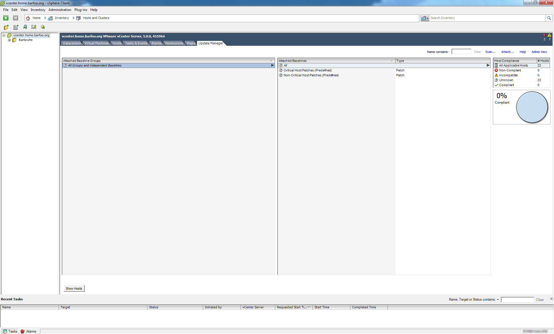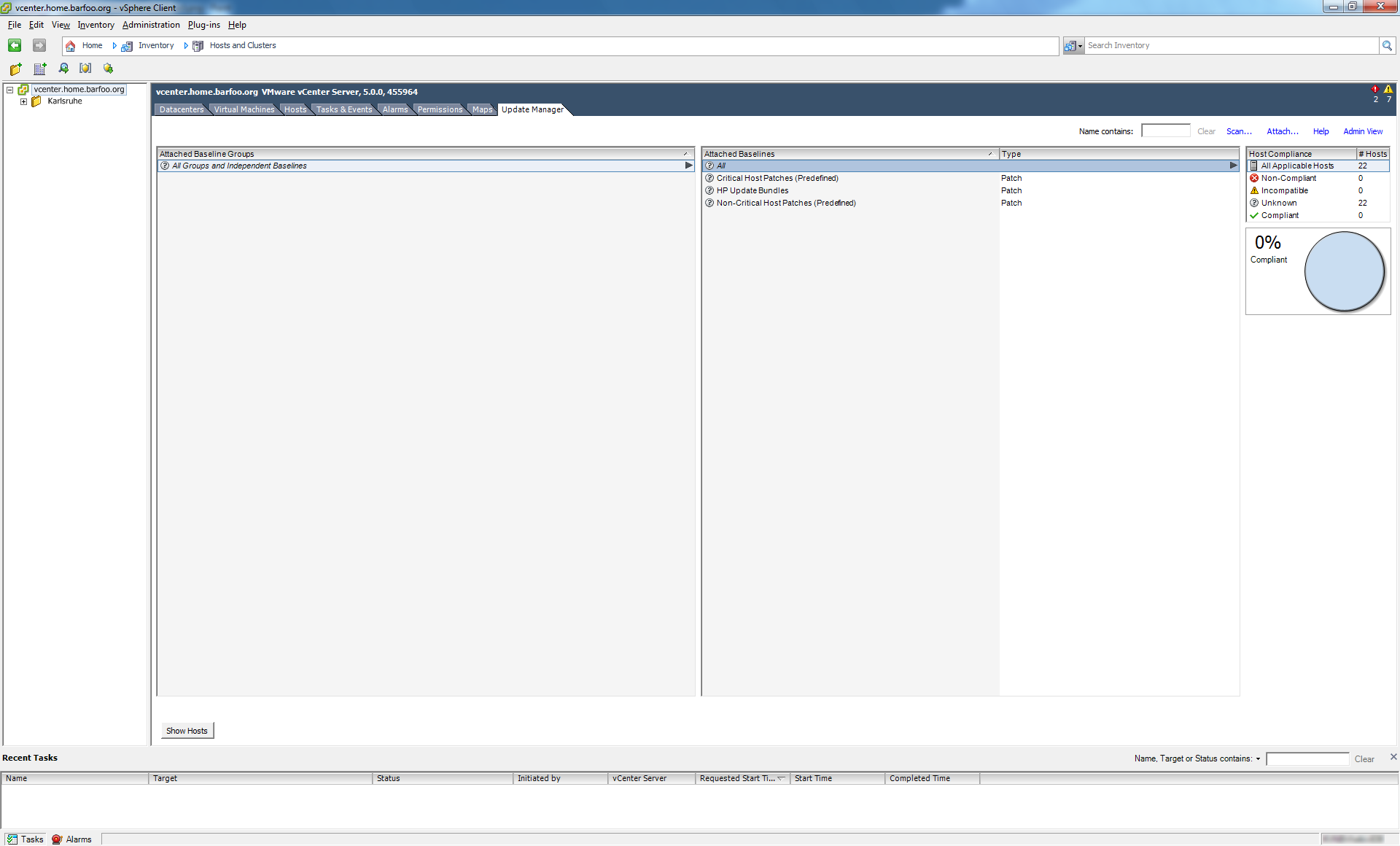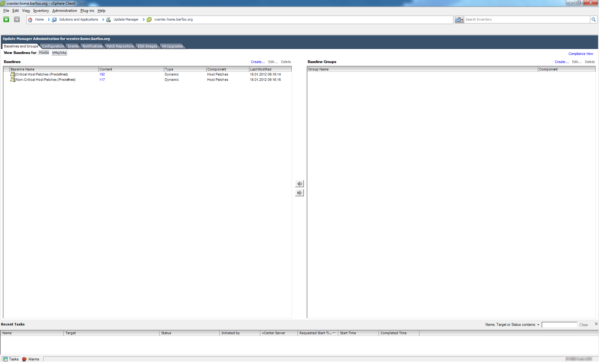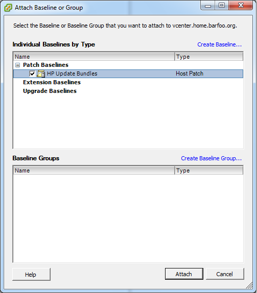So basically what you do is, add the VIB repository to your vCenter Update Manager download list, and then create a dynamic baseline for everything “Hewlett-Packard” and attach that to the desired level of your environment (I did it at the root level, as I only have Hewlett-Packard). But I’ll show you.