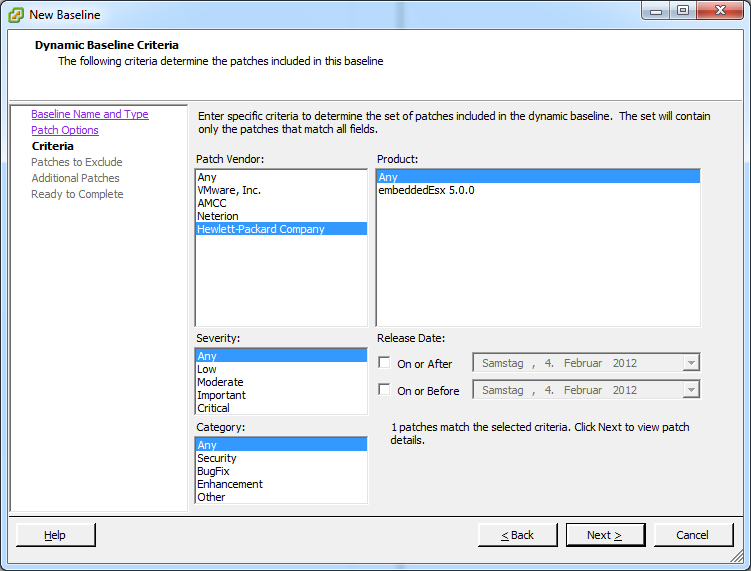 But since I selected Dynamic, I just need to apply a filter criteria in this next dialog, telling the baseline to select only VIB’s originating from the vendor “Hewlett-Packard Company”.