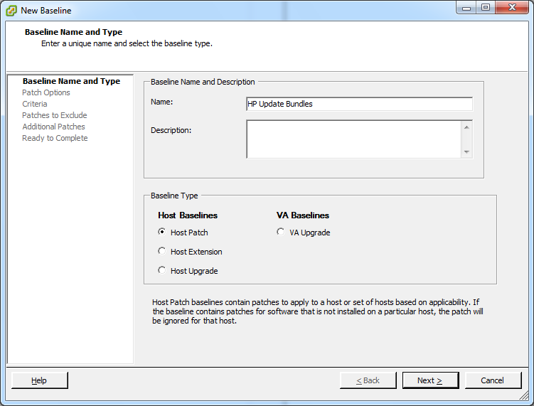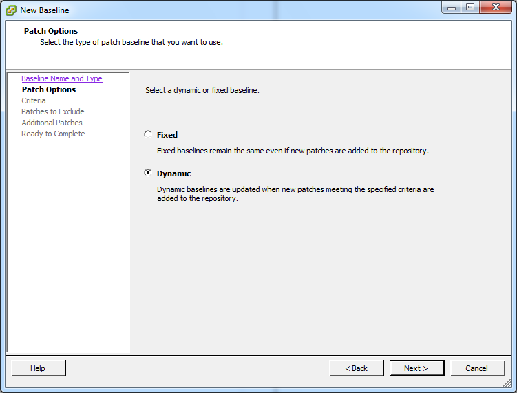 Next we want to select the baseline type. Based on your requirements you may either select Fixed or Dynamic. Since I don’t want to update the baseline each time HP releases a new VIB, I chose “Dynamic”. Keep in mind if you select Fixed, you need to select the VIB’s in the dialog window.
