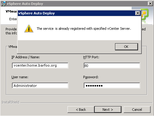 I went ahead and started the Auto Deploy setup from the DVD again, until I received this weird looking error. Apparently the setup thought (and decided correctly) that Auto Deploy was already installed in my vCenter.